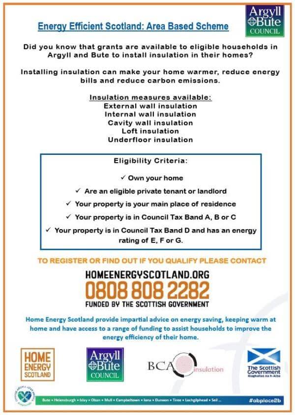 Visit https://energysavingtrust.org.uk/scotland/home-energy-scotland for details of home insulation grants available to households in Argyll and Bute.